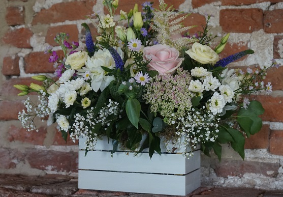 Flowers are arranged in water retaining foam (oasis) which is secured in a container, usually a concealed plastic saucer or a coloured zinc pot. There are different shapes you can choose from.
